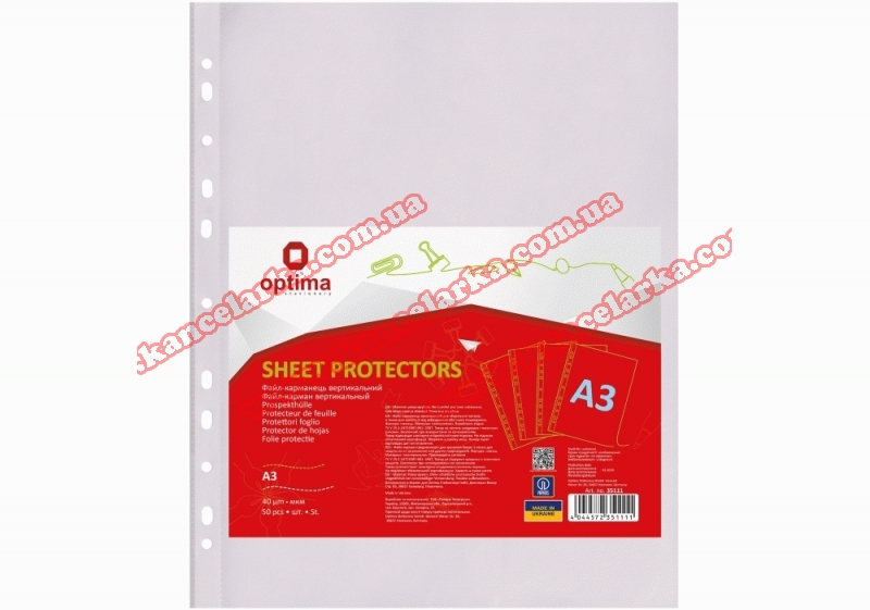 Файл для документів А3 Optima, 40 мкм., вертикальний, фактура 'глянець' (50 шт/уп), O35111 O35111