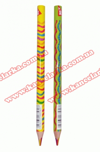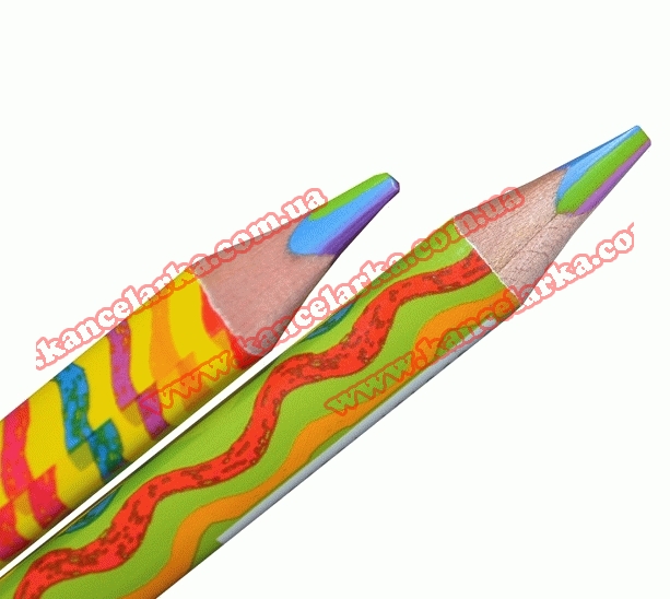 Один олівець-шість кольорів! Унікальний грифель олівця містить 6 класичних кольорів: жовтий, зелений, червоний, синій, бузковий, фіолетовий. Корпус олівця тригранний, збільшеного (Jumbo) діаметра, виготовлений з високоякісної деревини. Завдяки застосуванню спеціальних технологій центрування і проклейки стрижня в корпусі він не ламається при заточуванні, стійкий до падіння. Стрижень не кришиться при малюванні, м'яко малює соковитими кольорами. Діаметр грифеля 4мм; діаметр корпусу 1см.