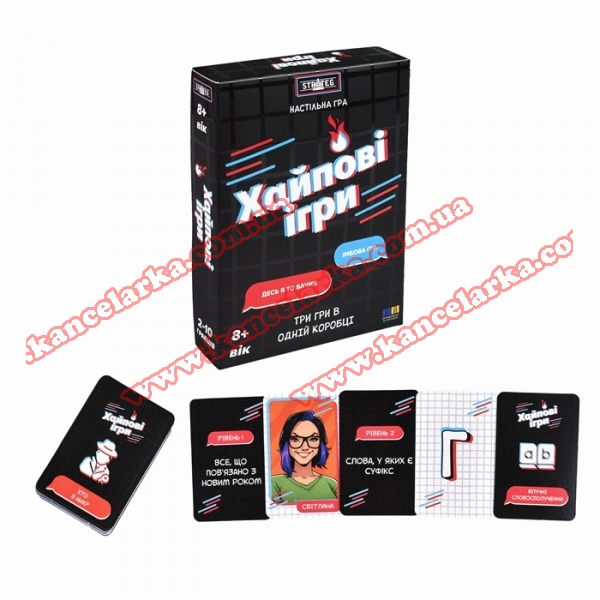 «Хайпові ігри» — це добірка трьох найцікавіших ігор із соціальних мереж в одній коробці. Вони створені для компаній друзів, що люблять логічні загадки, швидкі реакції та веселі інтелектуальні батли.