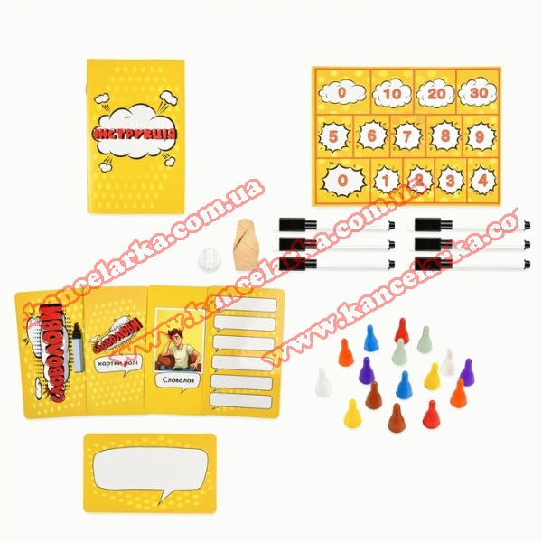 ♦ Комплектація: коробка, картки ролей - 8 шт., картки для написання - 6 шт., маркери - 6 шт., ігрове поле, фішки - 16 шт., фішка першого гравця, підставка, інструкція.