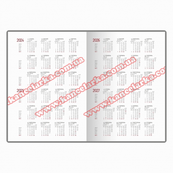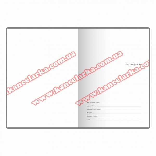 Діловий щоденник недатований. Формат 145х202 мм. Кількість сторінок 256. Блок білий офсет 70г/м2, клітинка. Колір капталу та лясе - білий. Мова укр., англ. Форзац - без друку білий. Обкладинка штучна шкіра.